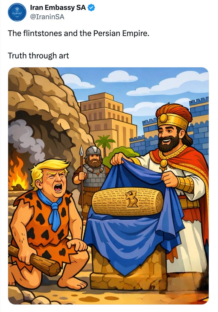 My theory is this: if they’re not Gen Z diaspora Iranians, they’re likely ones inside Iran. The attention to detail is a sign of an Iranian youth who learned English, lives on social media, and grew up downloading and watching bootleg Hollywood films—hardly unusual. It’s also possible they’re behind some of the recently meme-heavy social media accounts linked to Iranian embassies and Parliament Speaker Mohammad Bagher Ghalibaf, which have taken to trolling the United States and Israel (X/X/X/X). One could argue they’re winning the propaganda war online…