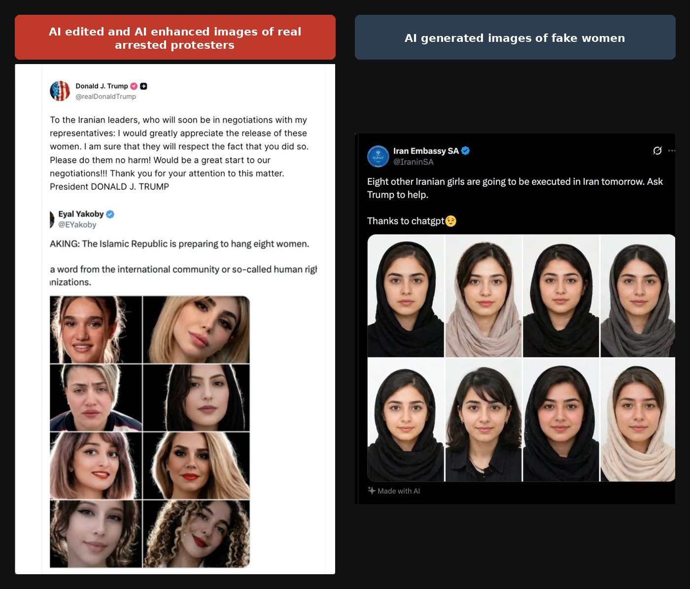Another example of narrative distortion emerged when the US president and State Department highlighted eight Iranian women who were all alleged to have been sentenced to death (Reuters). The women—Bita Hemmati, Diana Taherabadi, Ensieh Nejati, Ghazal Ghalandari, Golnaz Naraghi, Mahboubeh Shabani, Panah Movahedi and Venus Hosseininejad—are real and were arrested during the January anti-regime uprising, according to the Center for Human Rights in Iran (The National). However, their sentences differed, and only one—Hemmati—was sentenced to death. Additionally, their real photos were AI-enhanced or modified, according to WITNESS’ Mahsa Alimardani, which raised questions about the authenticity of them all together (TechPolicy.press) As The Verge noted, this case is a “mingling of fact and fiction into a fuzzy distortion that fuels an endless disputation of real human rights violations,” and plays into the Islamic Republic’s hands (as seen below).